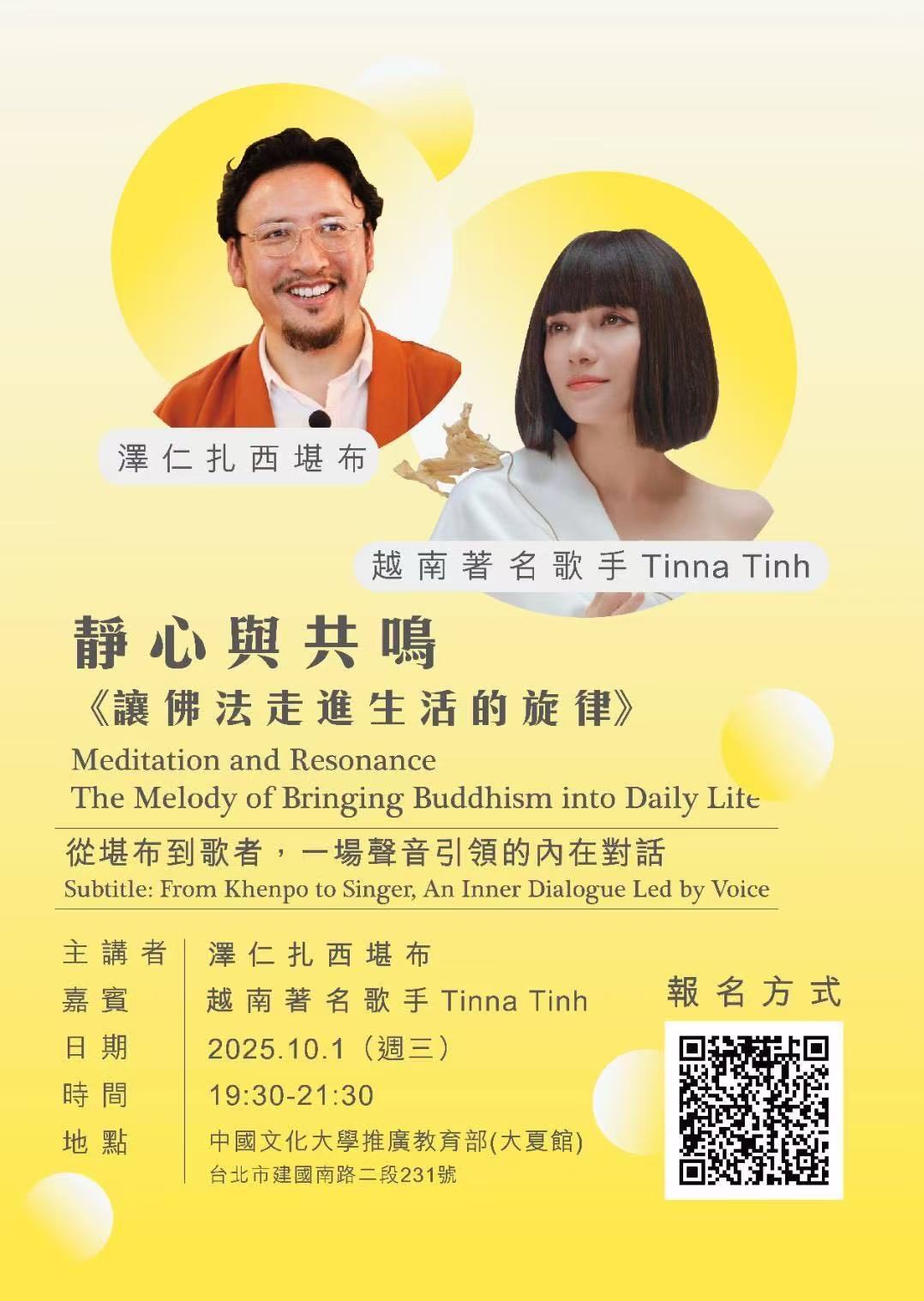 2025.10.1(週三)19:30-21:30在中國文化大學推廣教育部(大夏館),台北市建國南路二段231號,將要舉辦一場盛大的活動。該次活動由澤仁扎西堪布主講的,活動主題為:静心與共鳴《讓佛法走進生活的旋律》,越南著名歌手Tinna Tinh將擔任此次活動嘉賓。