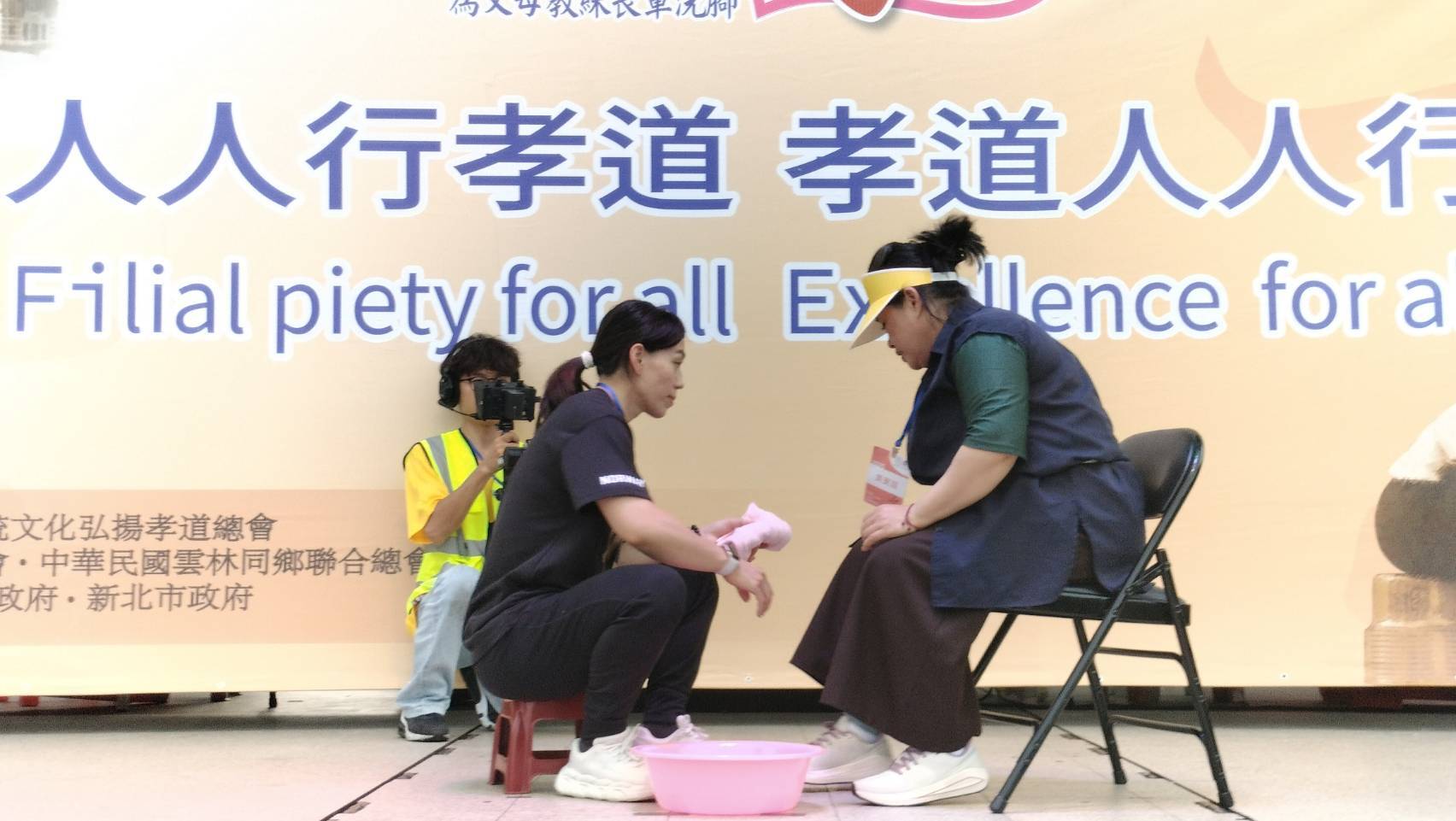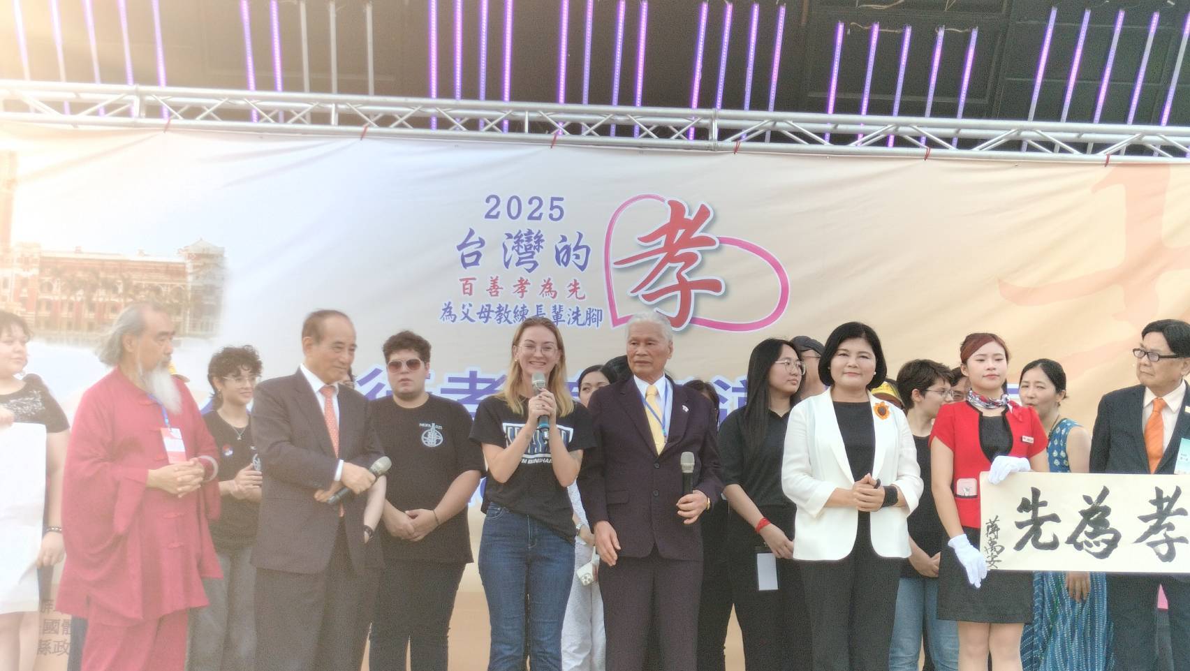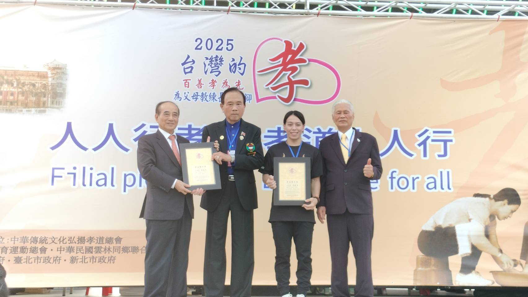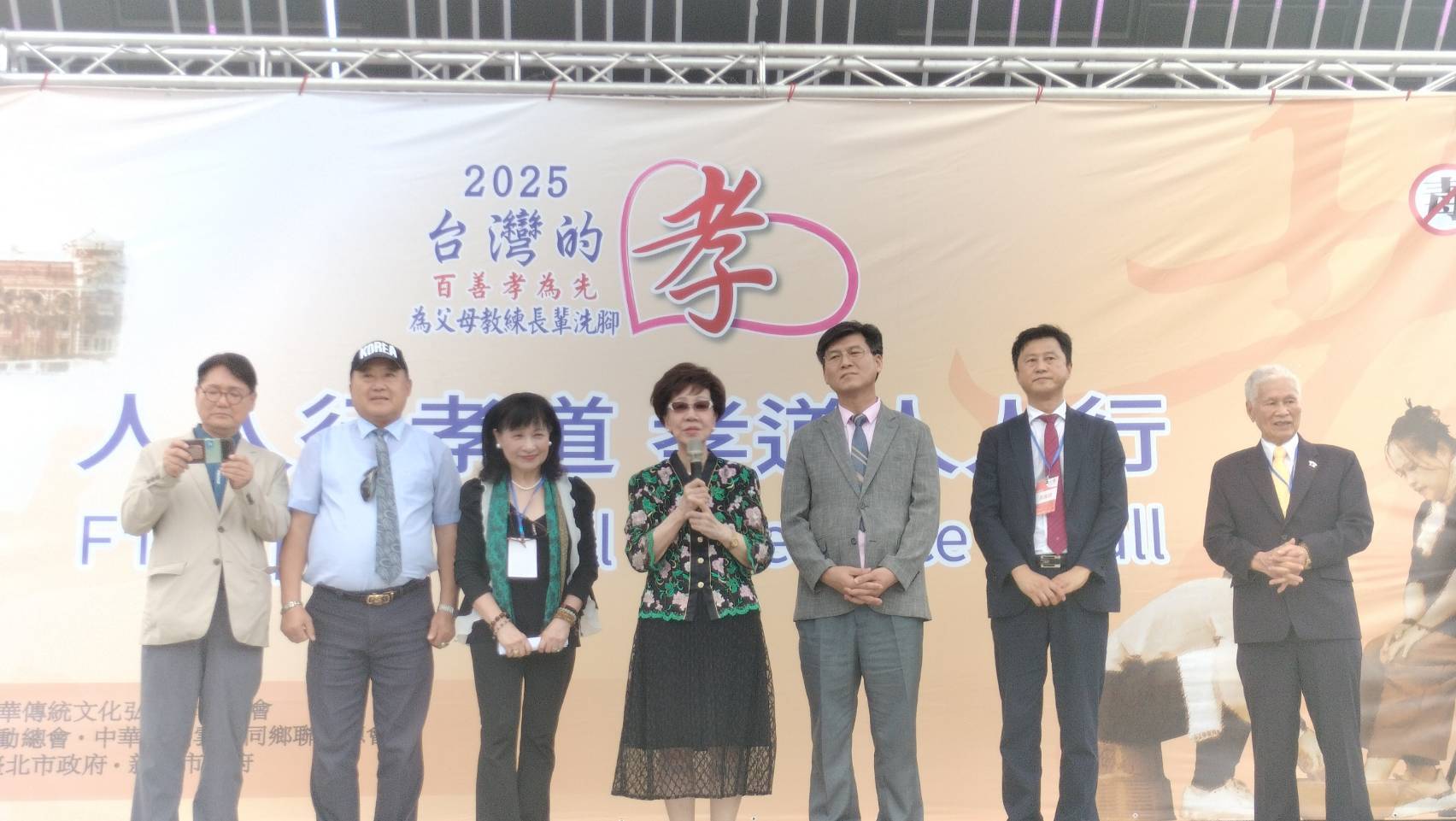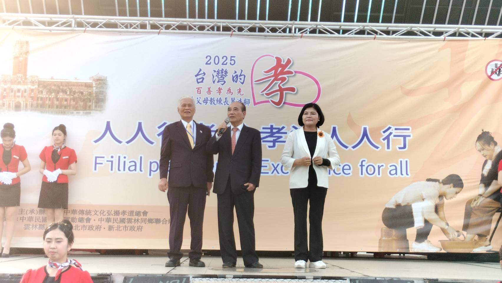 〔中華傳統文化弘揚孝道總會〕榮譽總會長 王金平(前立法院長),在活動上揮毫〔人人行孝道・孝道人人行〕,致贈給總會,希望最具特色的萬人孝親洗腳報天恩活動,能夠迅速地推廣到全世界,讓孝行天下!同時主辦單位之一的台北市長蔣萬安,不但每年都帶領市府團隊參加活動,今年也現場揮毫〔百善孝為先〕,期待台灣的孝,能夠從台灣走向國際,期待台灣不僅是中華傳統文化的擁護者、傳承者,更是弘揚者!