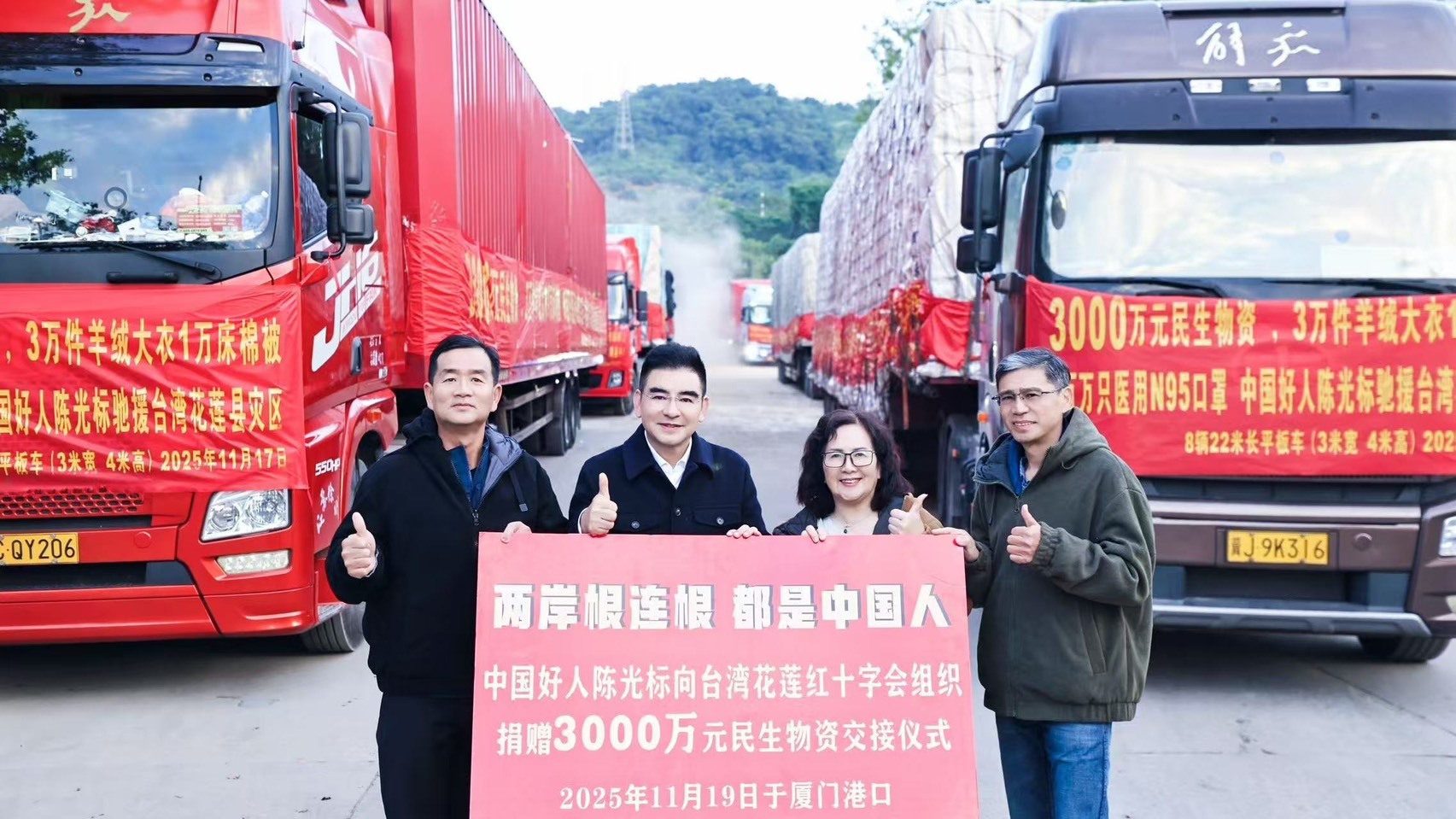 11月19日,廈門港一場跨越海峽的愛心傳遞在海風輕拂的碼頭正式啟幕。中國首善陳光標通過台灣花蓮縣紅十字會捐贈的3000萬元民生物資,完成裝船啓運前的交接儀式。這批救援物資將定向馳援花蓮地震災區,爲受災民眾送去禦寒保障與防疫支持。