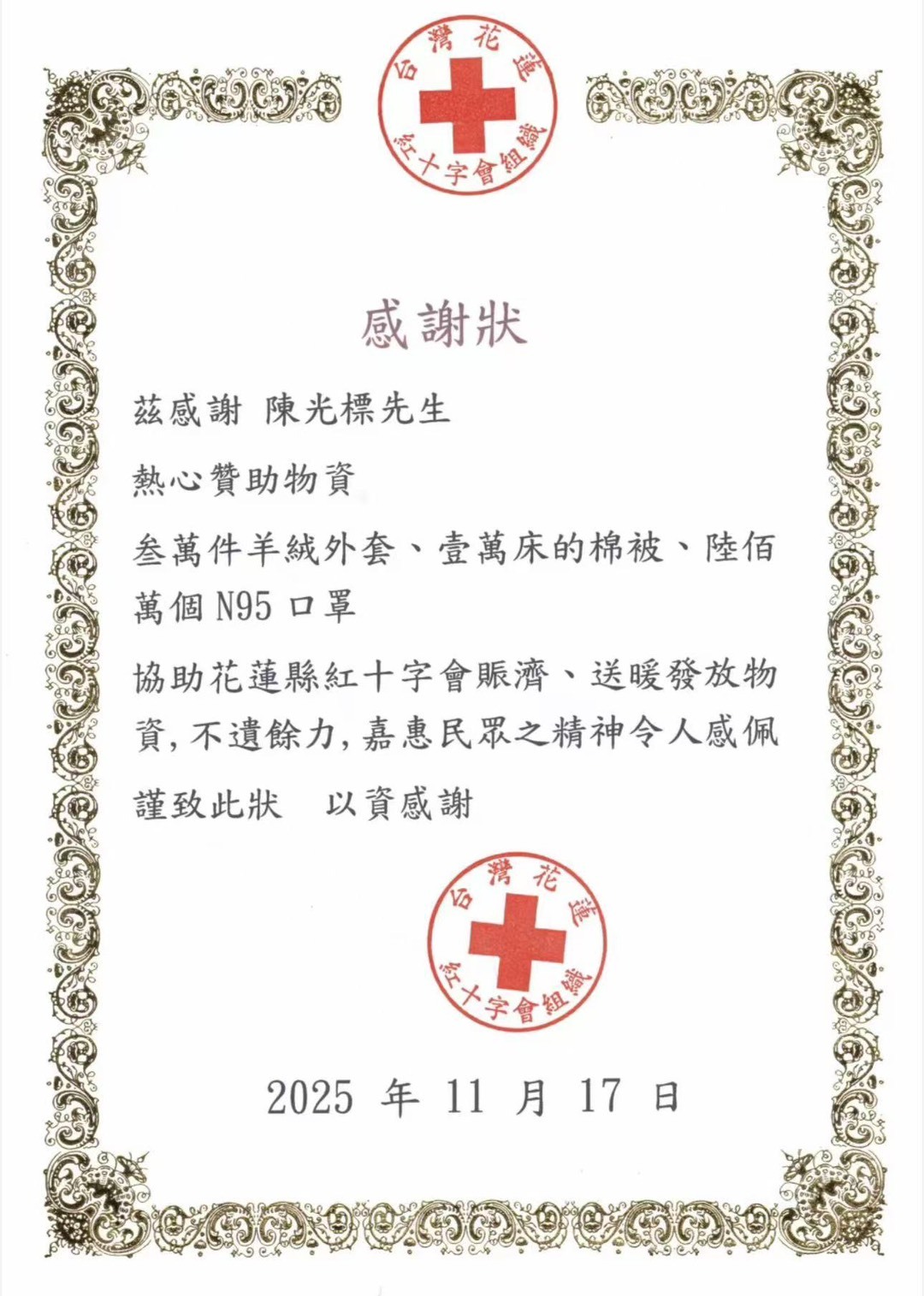 陳光標自2009年莫拉克風災捐贈300萬元起,已持續16年關注台灣災情。他表示將持續關注台灣清寒民眾,因爲兩岸根連根,都是中國人。他特別提到,此次捐贈的羊絨大衣均採用環保再生材料,踐行其長期堅守的“綠色慈善”理念。