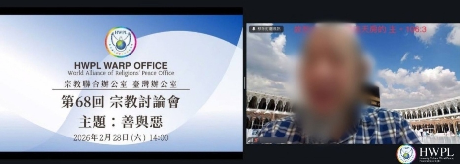 天上文化世界和平光復(HWPL)臺灣支部宗教聯合辦公室於2月28日,以「善與惡」為主題舉辦第68次線上座談會,邀請佛教、伊斯蘭教與基督教代表,依據各自宗教經典進行深入探討與交流,展現跨宗教對話的實質內涵。