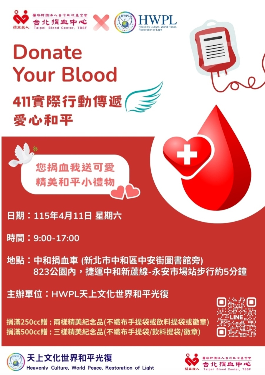 當和平不只是理念,而是能被實際行動展現,會是什麼樣的樣貌?致力於透過和平教育、宗教和諧及公民參與,將和平理念落實於日常生活的國際和平非政府組織「天上文化世界和平光復(HWPL)」將於2026年4月11日上午 9點至下午5點在新北市中和捐血車(中安街圖書館旁 823 公園內)舉辦「Donate Your Blood」捐血活動,邀請民眾透過捐血實踐愛與和平。